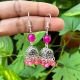 German Silver (Box) Jhumkas With Semi Precious Beads, Dark Pink