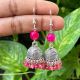 German Silver Jhumkas With Semi Precious Beads, Dark Pink
