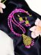 Printed glass beads necklace with oxidised gold pendants, purple with pink